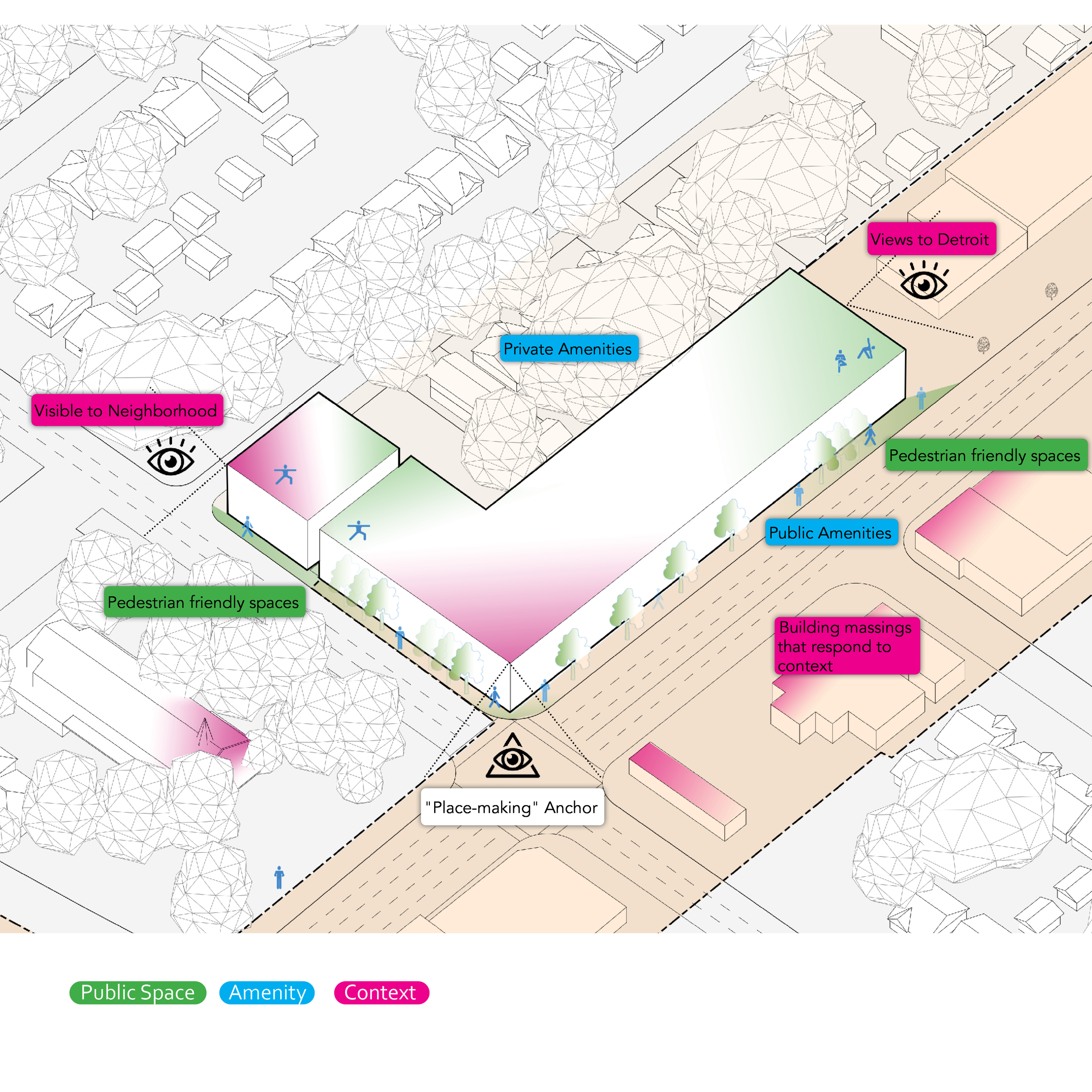 A stepped massing with terracing outdoor amenity spaces and private zones was envisioned along Ford Rd, blending scale of neighborhoods with building mass transitions while connecting the street life with private housing programs above.